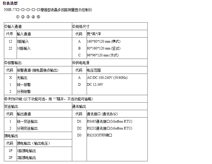例1:NHR-7712-A-1-A-1/D1(統一報警輸出/統一變送輸出)